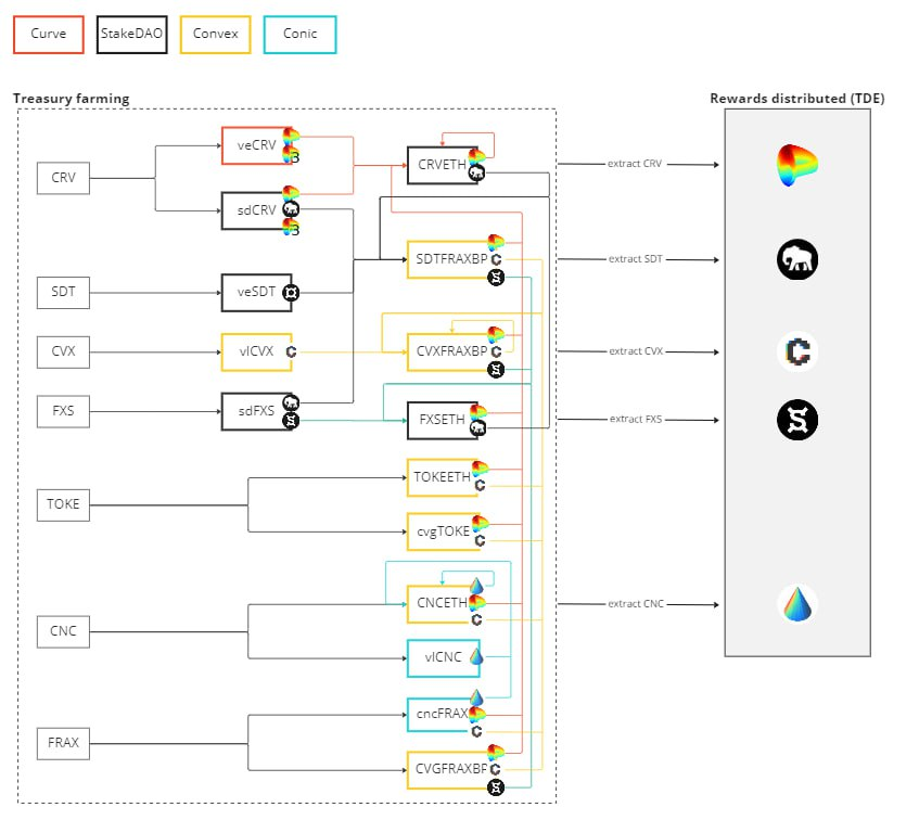 One scenario of how the bribes earned from veCRV/sdCRV is that they will be swapped to CRV and compounded into CRV/ETH on Stake. Bribes earned from vlCVX swapped to CVX and compounded into CVX/FraxBP.