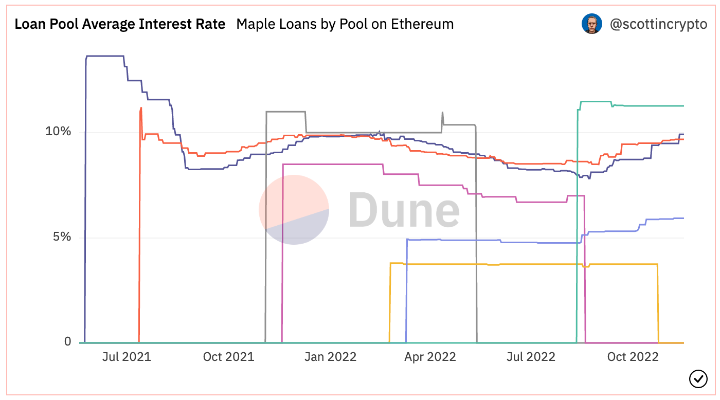 With the fast de-leveraging of these centralized entities, there was a void of liquidity in the market and profitable crypto-native institutions turned to DeFi solutions to fill in the space. The market saw the rise of Orthogonal Credit, M11 Credit, and Blocktower Credit, which are credit funds that provide direct lending on venues such as Maple finance to market makers, e.g. Wintermute, Auros and Flow Traders, allowing them to draw USDC at 8.5-10% and draw wETH at 5-6%.