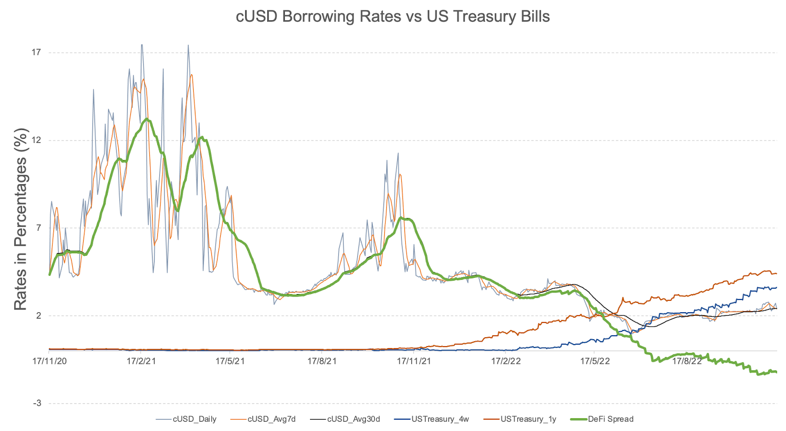 While DeFi volumes today depend on trading players whose health dictates how active DeFi is, a more balanced ecosystem would welcome players beyond traders, who can leverage the efficiency and transparency of this new paradigm. With the US Fed Funds target rate turning to 3.75 to 4.00%, the DeFi spread (the difference between DeFi borrowing rate and US treasury) has turned to -1.2%, which begs the question — Does it still make sense to invest DeFi capital in Compound’s cUSDC pools where yields are less than 2%? Where will DeFi capital go?