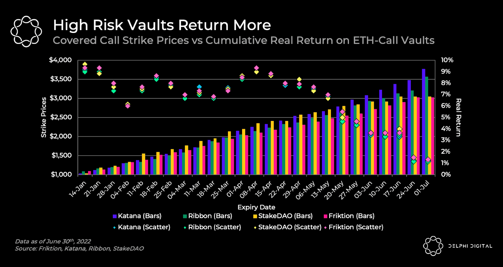 Asset management products have also moved on-chain, democratizing investment strategies that historically were only available to large institutional clients. Leveraging smart contracts and unique crypto-native non-linear yields, strategies such as DeFi Option Vaults (DOVs) saw breakout volumes in 2021, with $1 Billion in Total Value Locked (TVL) at its peak. Vaults like Ribbon Finance, Friktion, and Antimatter, provide simple UI/UX to allow retail investors to tap into vanilla option premiums. From underwriting out of money covered calls and vanilla puts, retail investors saw these option premiums reeling in 20 to 40% of returns at the time, which looked very competitive and more sustainable compared to incentive based yield farms. On the back of these retail underwriting, institutional options market makers would buy the entire vault of options and sell on exchanges such as Deribit which saw 90% of total crypto option flow at some point. Currently option vaults face lower volumes due to several reason: