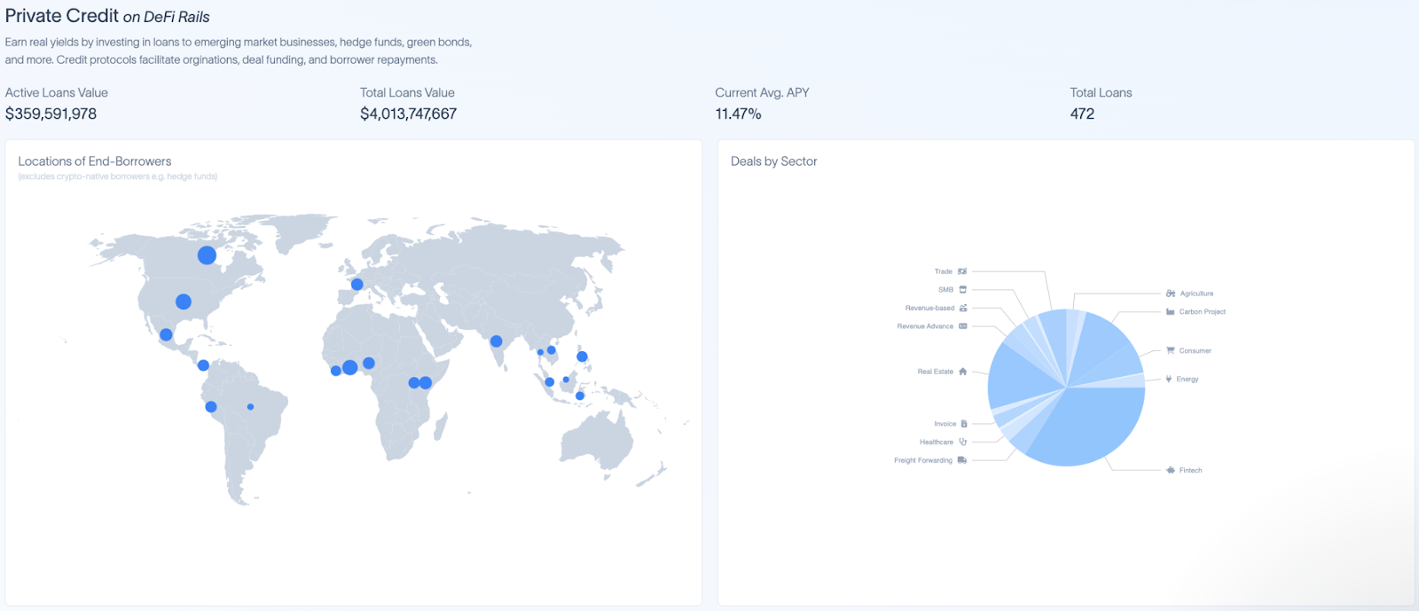 Real-world assets collateralized by DeFi institutional lendings are mainly private credits. As of the time of writing, there are active loans amounting to $359 million with an average APY of 11.47% that offer on-chain loans to real-world borrowers. The top real-world borrowers are from fields such as fintech, real estate, and carbon projects, among others.