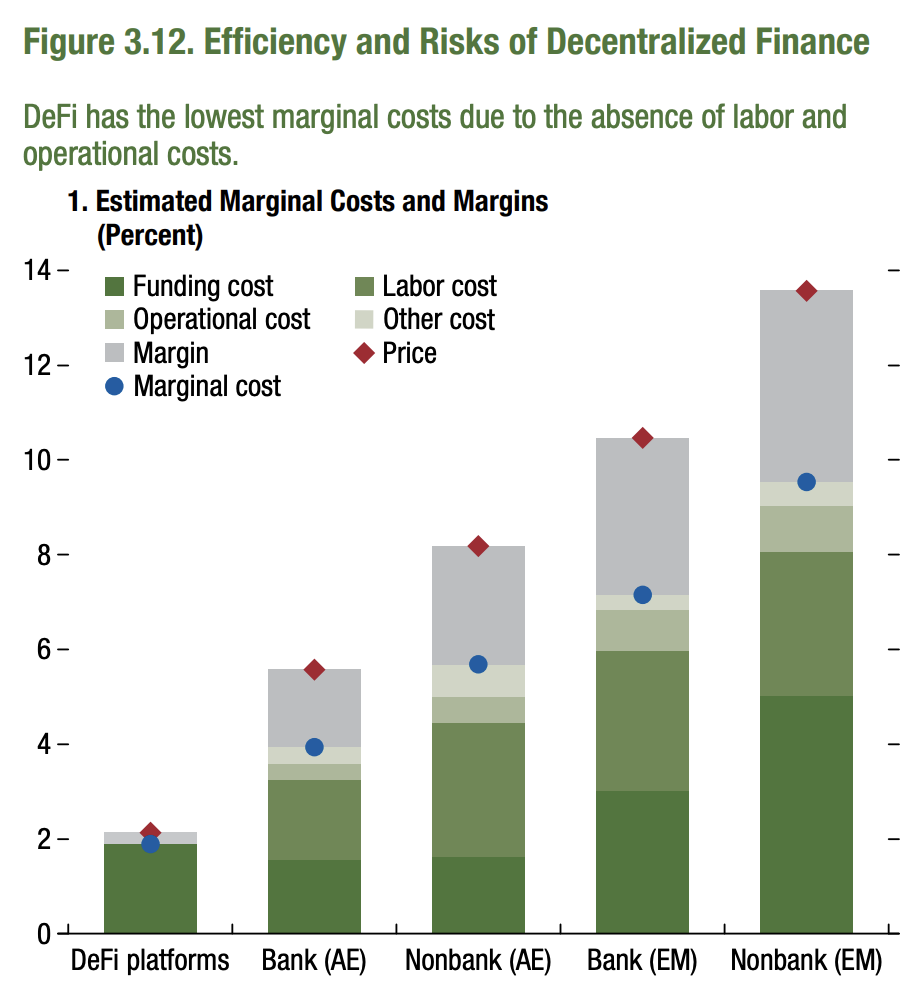 Traditional financial institutions can reduce operational costs by leveraging DeFi technology. Based on the IMF's report, compared to traditional financial institutions, DeFi has significantly lower labor costs, with smart contracts governing on-chain transactions and validators performing verification and record retention. Traditional finance, which is profit-driven, can simply leverage blockchain technology to save labor costs and further boost its profits. As such, DeFi protocols that help onboard traditional financial institutions to blockchains will thrive. An example is Quant Network, which gains traction by connecting traditional financial institutions with multiple distributed ledger networks.